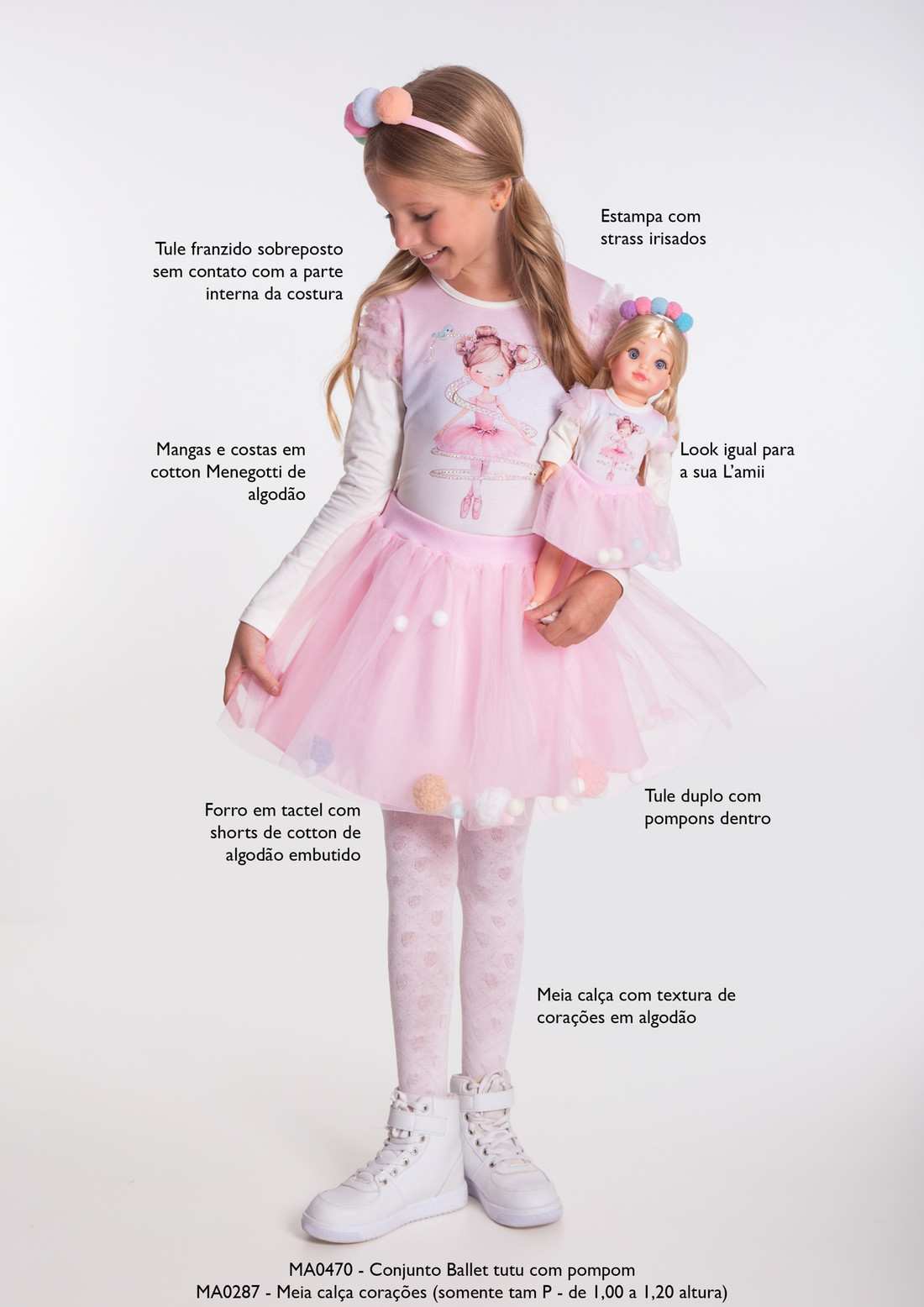 A saia é um espetáculo à parte: confeccionada em tule duplo, ela guarda uma surpresa divertida — pompons coloridos soltos entre as camadas, que se mexem conforme a menina dança! Para brincar sem preocupações, a saia possui forro em tactel estruturado e shorts embutido em cotton de algodão. E claro: o look acompanha a roupa igualzinha para a boneca (compatível com L'amii)! 👯♀️💫