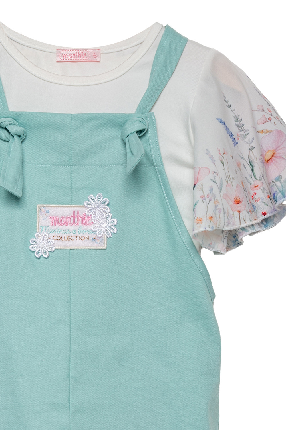 🩵 Jardineira: Confeccionada em sarja de algodão com elastano, tem toque macio e estrutura leve. O caimento soltinho garante conforto e movimento para as brincadeiras. Na parte da frente, um detalhe bordado com flores rendadas dá charme à peça, e as alças são ajustáveis com nó e caseado, pensadas para acompanhar o crescimento com delicadeza.