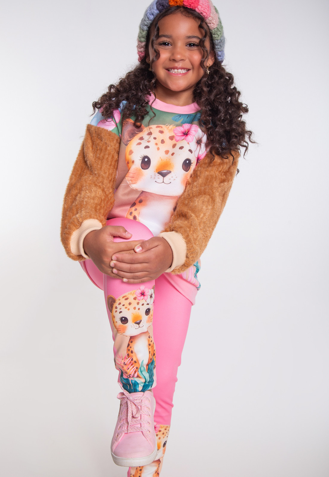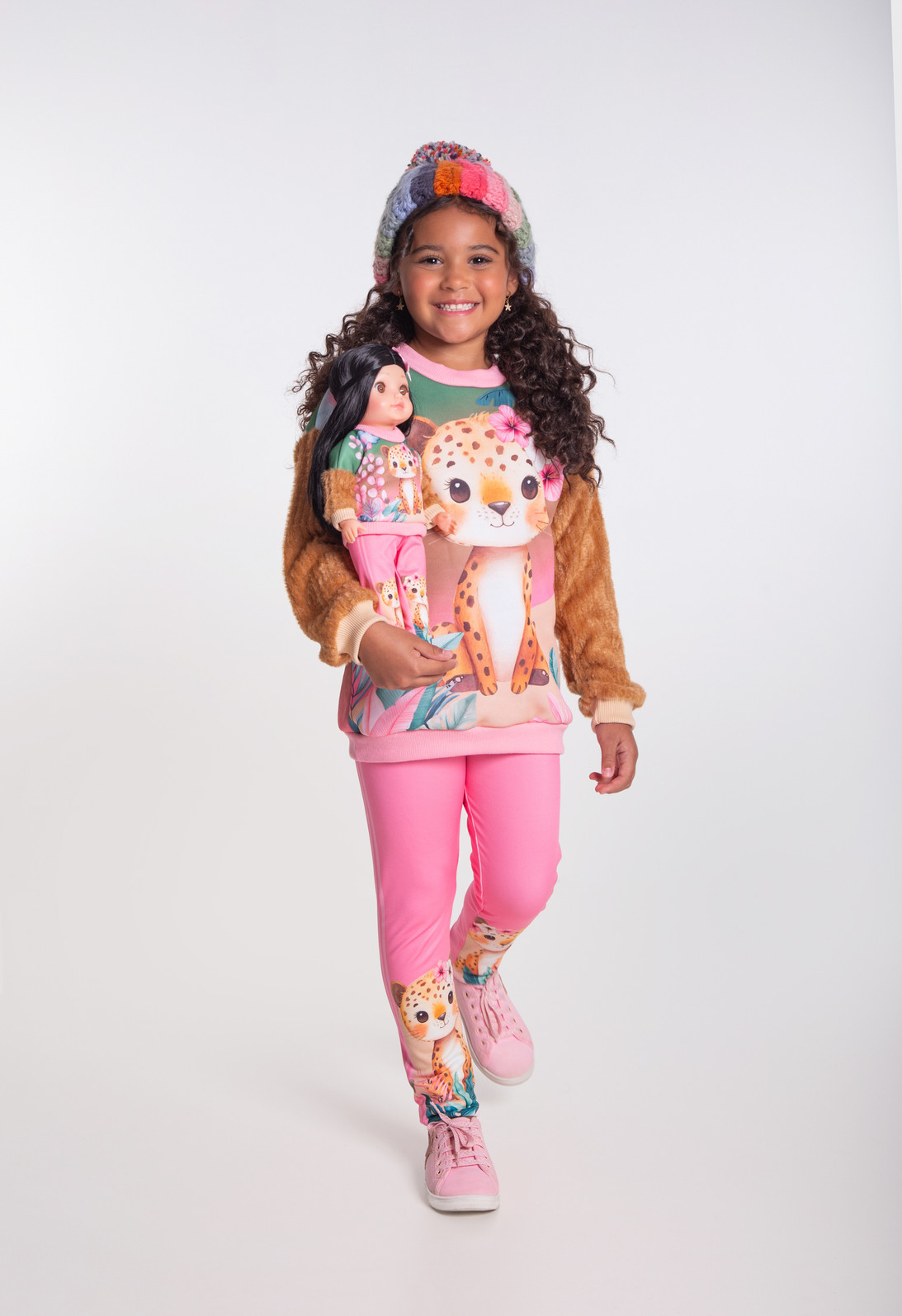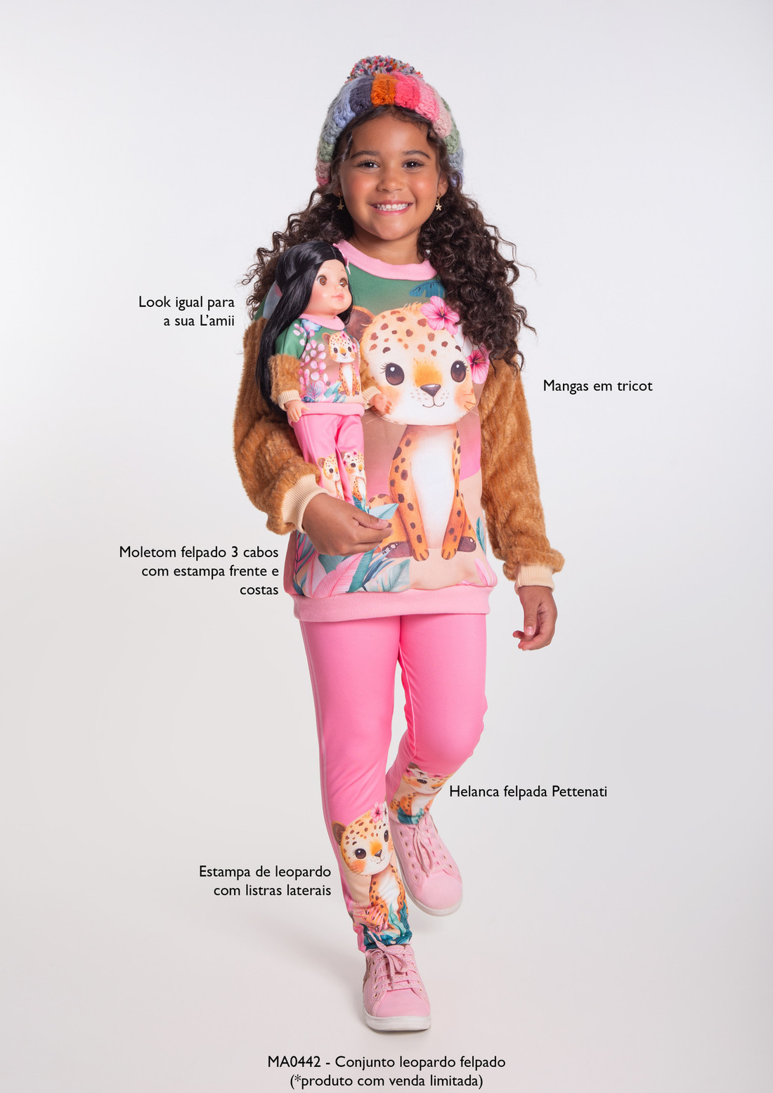 A calça legging, feita em Helanca Pettenati felpada, oferece toque macio e total liberdade de movimentos. Ela traz detalhes apaixonantes: estampa de leopardo na barra e listras laterais que alongam a silhueta com charme esportivo. E claro: o look acompanha a roupa igualzinha para a boneca (compatível com L'amii)! 👯♀️💫