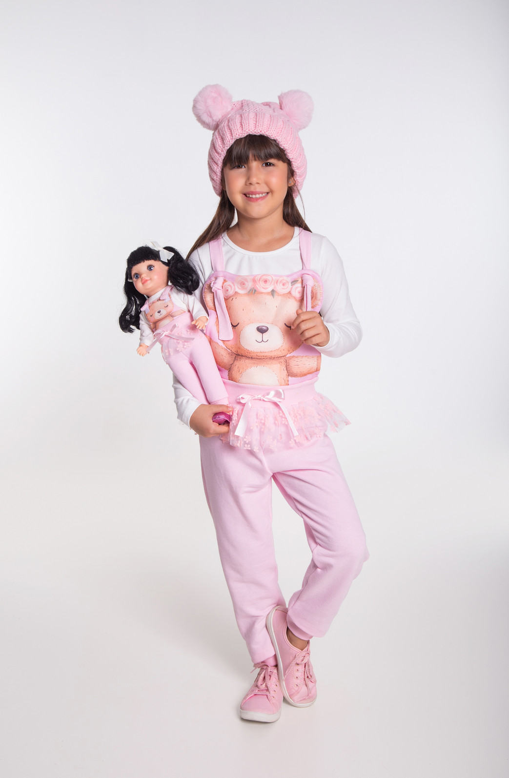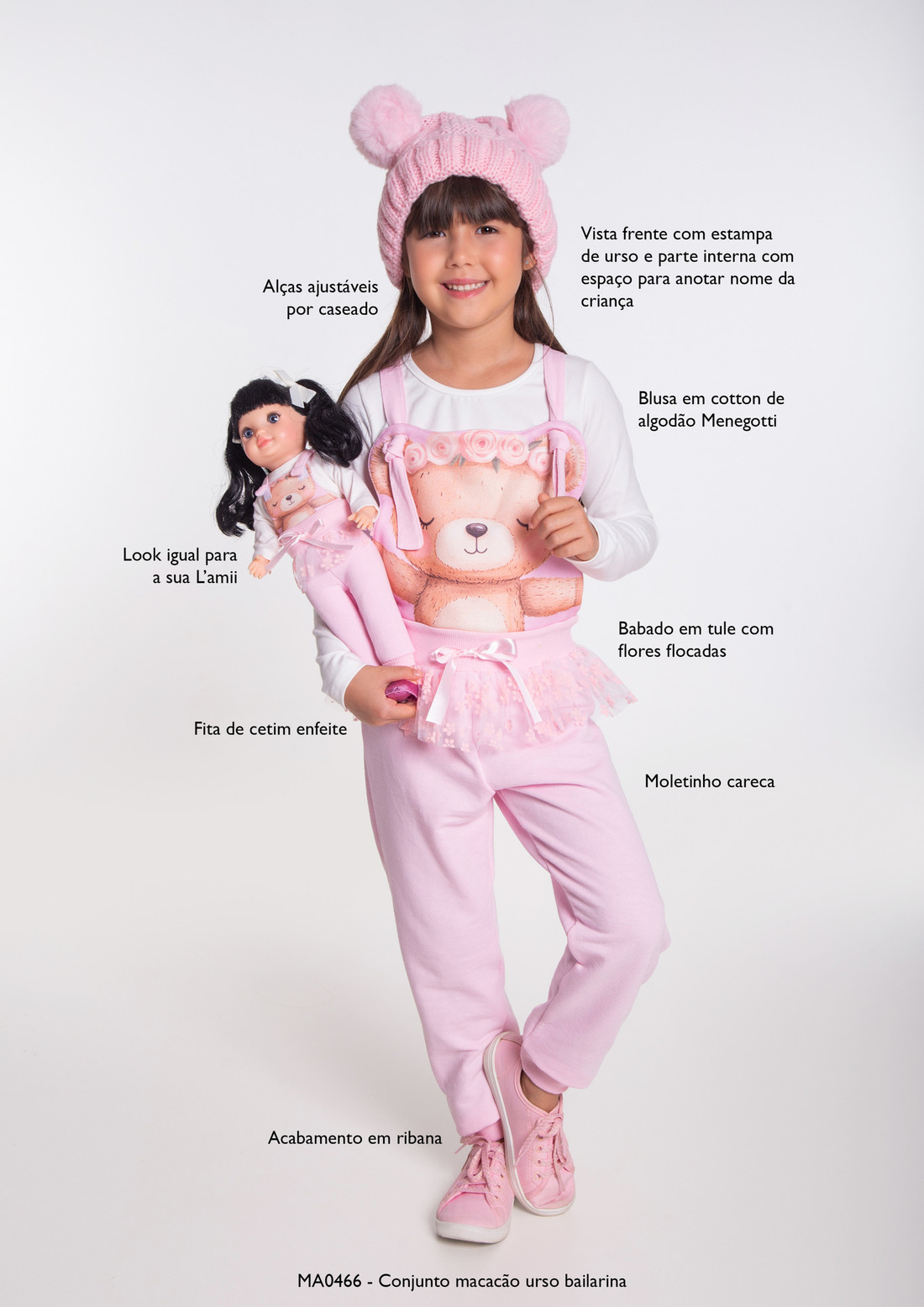 Pensando na praticidade, o macacão possui alças ajustáveis por caseado (acompanha o crescimento da criança!) e um detalhe inteligente na parte interna da vista: um espaço exclusivo para anotar o nome da criança, perfeito para não perder a peça na escola ou em festinhas. E claro: o look acompanha a roupa igualzinha para a boneca (compatível com L'amii)! 👯♀️💫