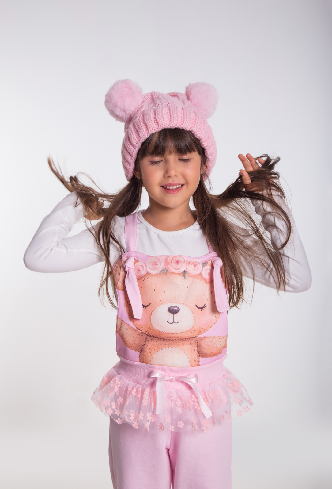 O conjunto é composto por uma blusa básica em Cotton Menegotti de algodão, suave e respirável, e um macacão em Moletinho Careca (leve e sem felpa). O destaque é a estampa frontal de Urso Bailarina, decorada com um delicado babado em tule com flores flocadas na cintura e fitas de cetim, trazendo a magia dos palcos para a roupa.