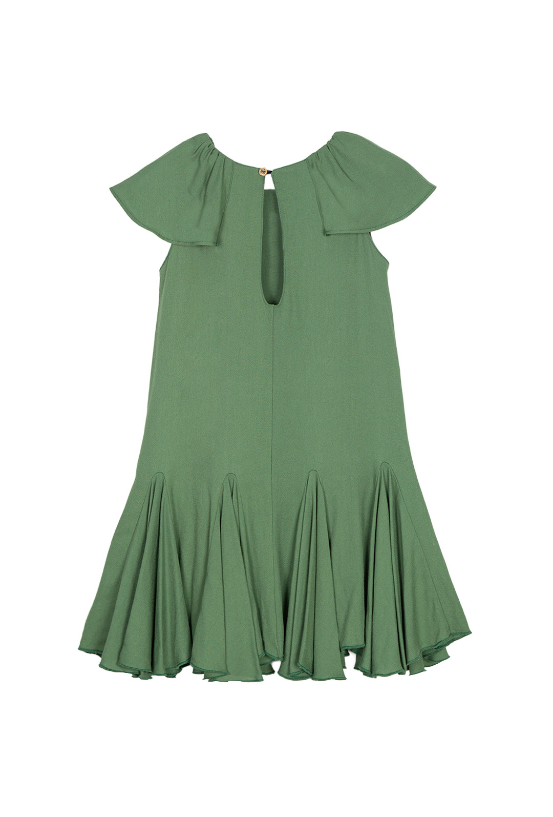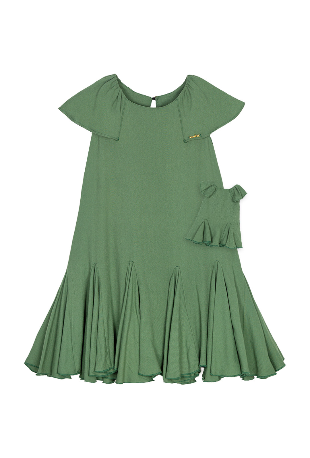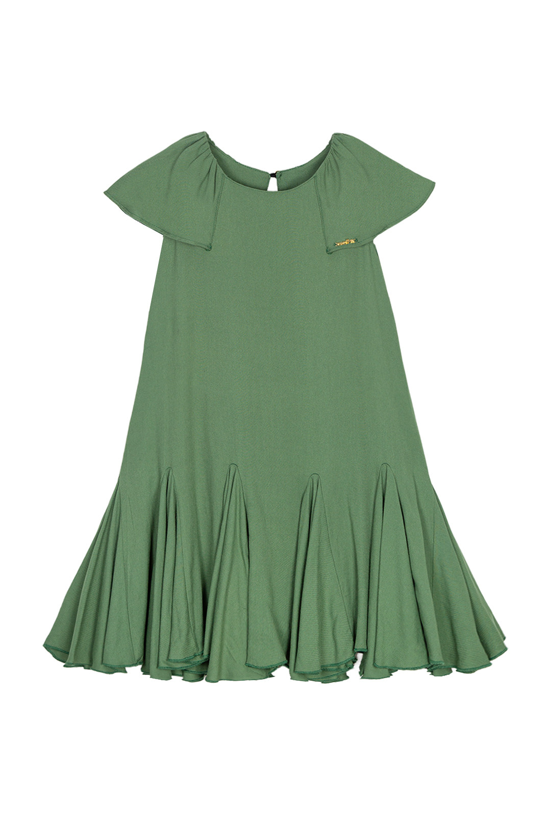 Puro encanto e movimento! O vestido é confeccionado em tecido 100% viscose, com dez nesgas em recorte godê na barra, criando um balanço impecável que encanta nas fotos e nas brincadeiras.
