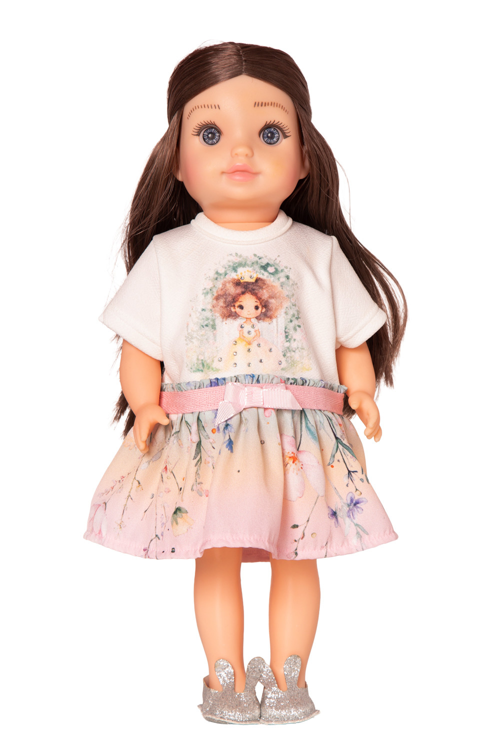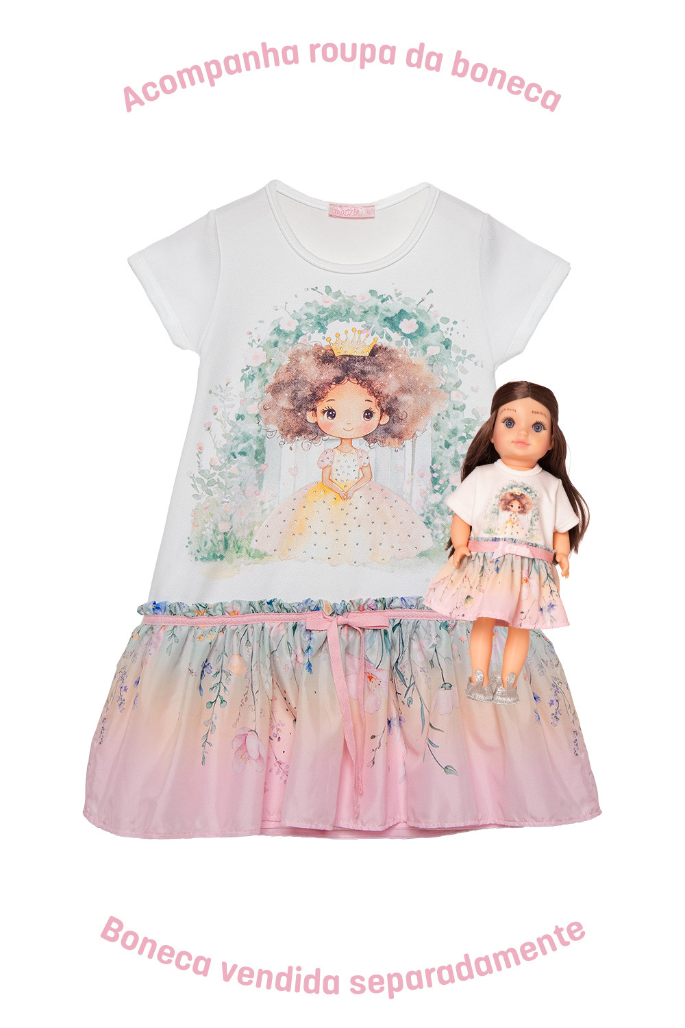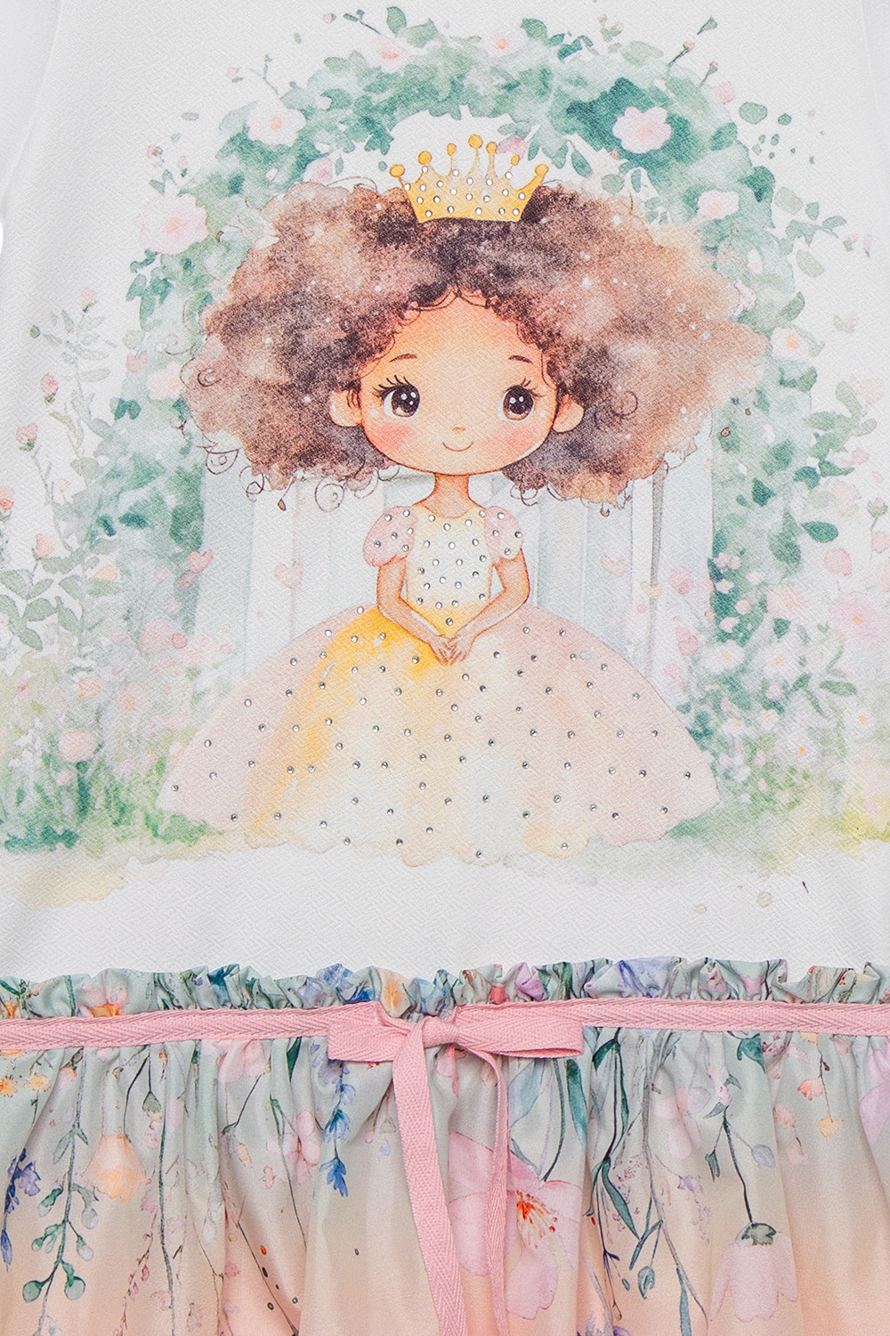 👗 Parte superior: A modelagem em formato A é feita em malha texturizada jacquard, com estampa central de uma princesinha delicada e aplicação de strass furta-cor, um verdadeiro detalhe mágico!